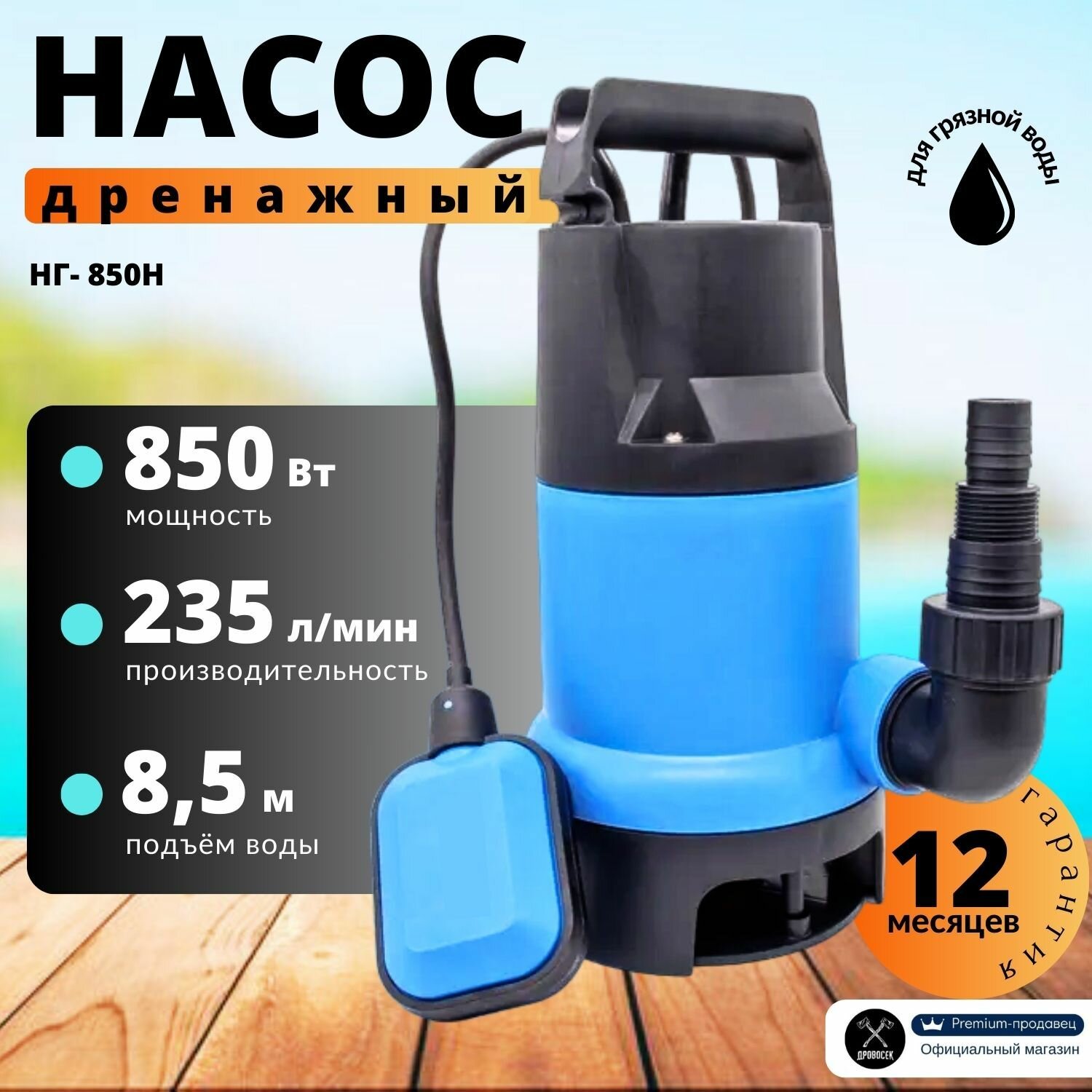 Дренажный насос для грязной воды варяг НГ-850Н/ насос для воды погружной с поплавковым выключателем, 850 Вт, 235 л/мин