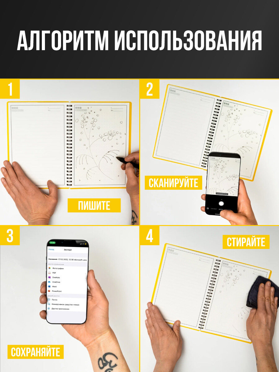 | Комплектация | Умный многоразовый блокнот на пружине, тряпочка из микрофибры для очистки страниц, ручка |