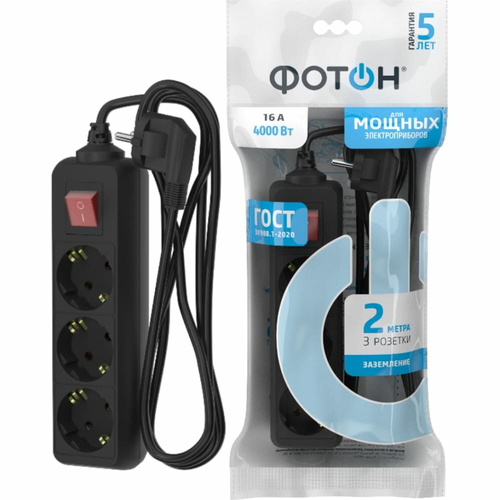 Удлинитель сетевой для розетки фотон 16А 2 метра 3 розетки с выключателем с заземлением черный, ГОСТ 536 ₽