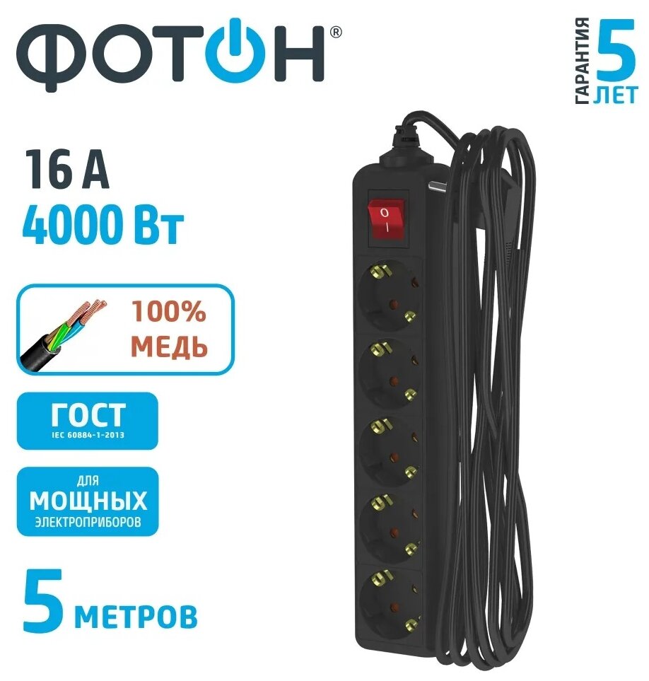 Отзывы на Удлинитель фотон 16-55ЕS, 5м, 5 розеток, 16А, с выкл, с заземл, Черный