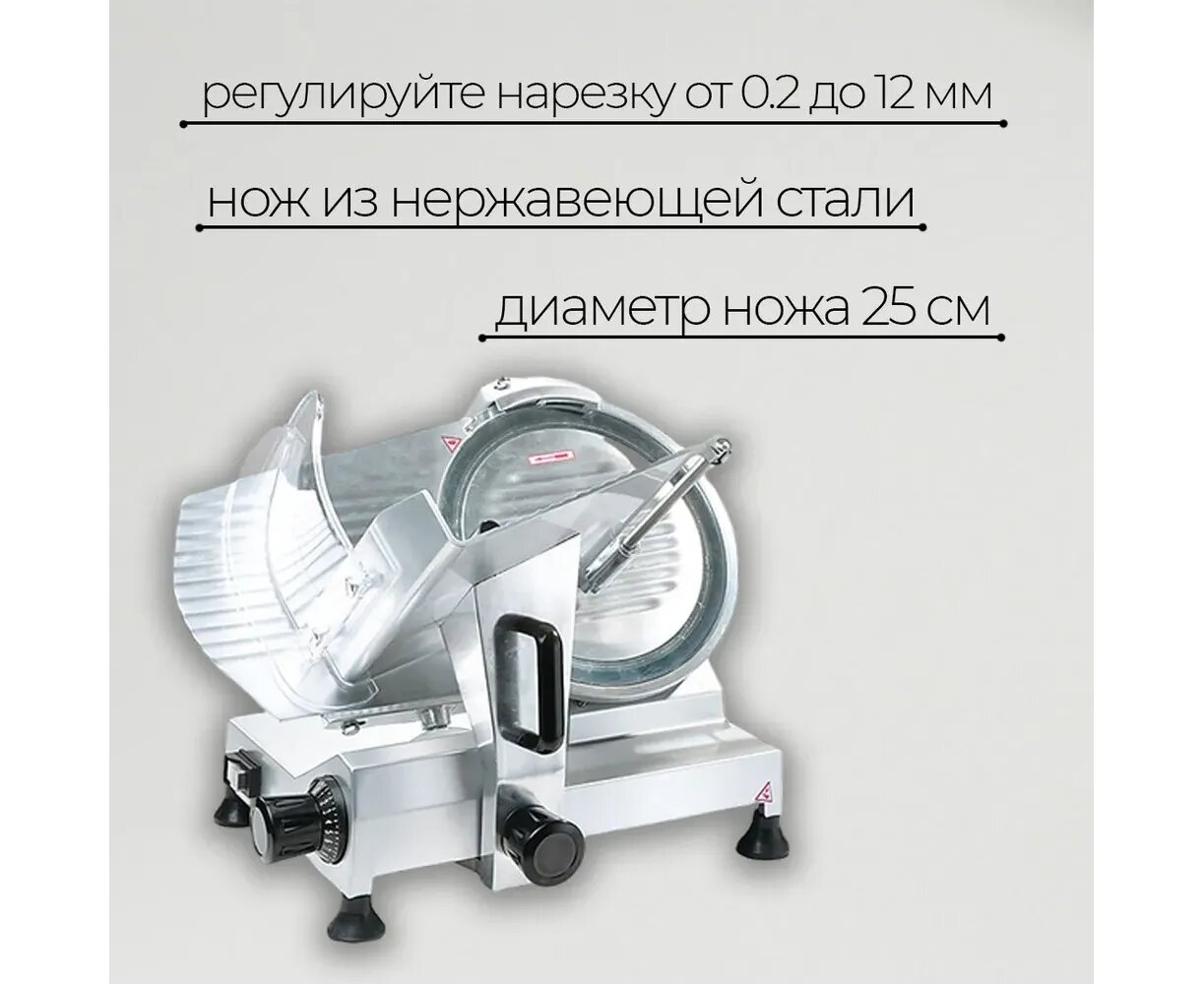 | Дополнительная информация | диаметр ножа, мм: 250, мин. толщина нарезки, мм: 0.2, макс. толщина нарезки, мм: 12, полезная режущая поверхность, мм: 180 |