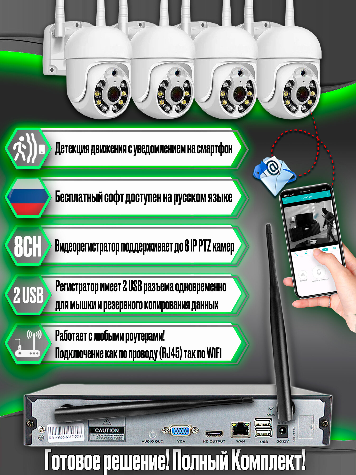 Цифровой готовый WiFi IP комплект система видеонаблюдения на 4 поворотные камеры для дома и улицы MiCam HiSecurity 5Mp информация:
