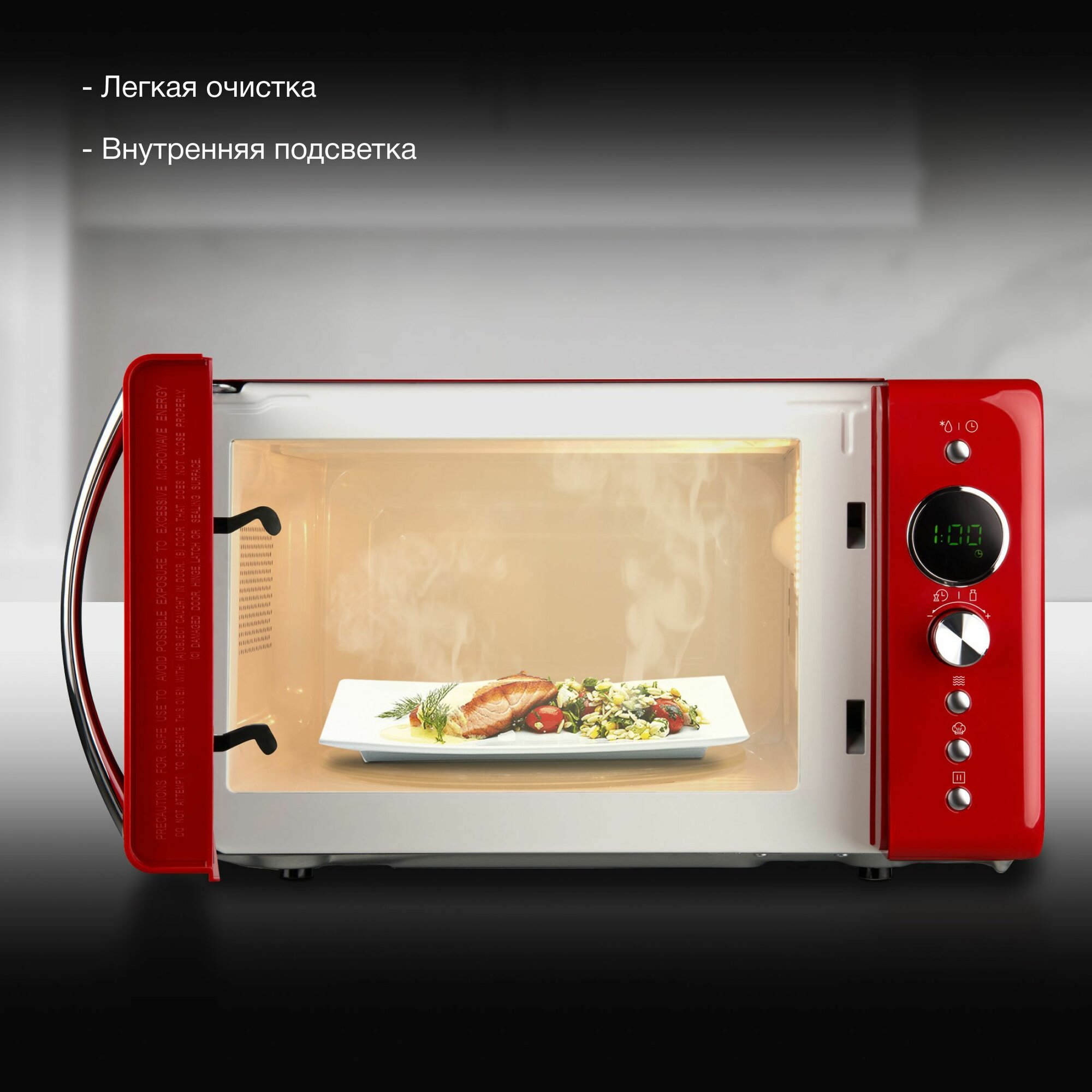 10 цен на Микроволновая печь Hyundai HYM-D3037 красный, с механическим управлением, поворотным столом 24,5 см, объем камеры 20 л, мощность 700 Вт, открывание дверцы ручкой, функции разогрева и разморозки