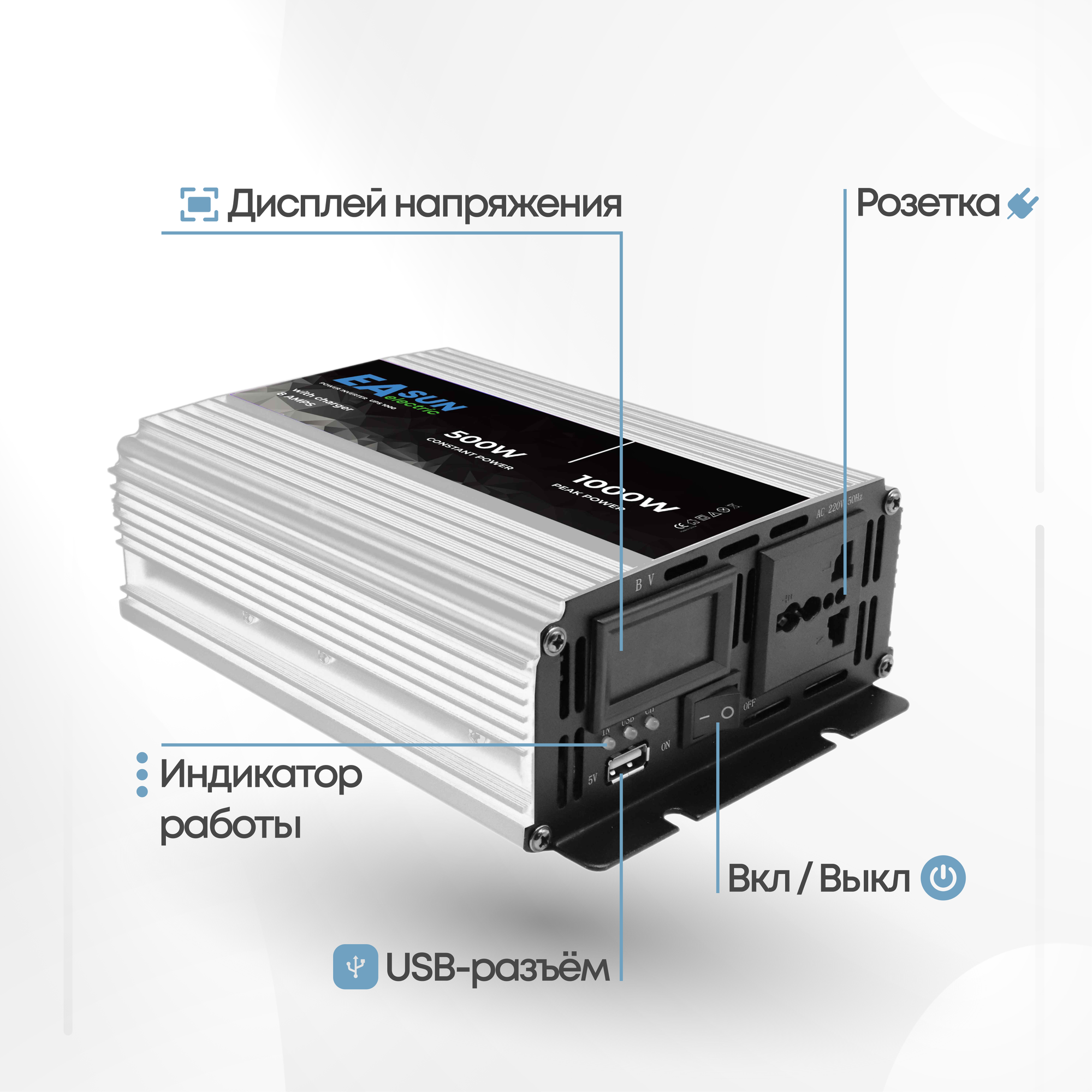 EASun Power Инвертор автомобильный 12 220В Power Inverter, 1000 Вт. Подключение приборов, инструмента. Преобразователь напряжения. Евророзетка, USB разъем