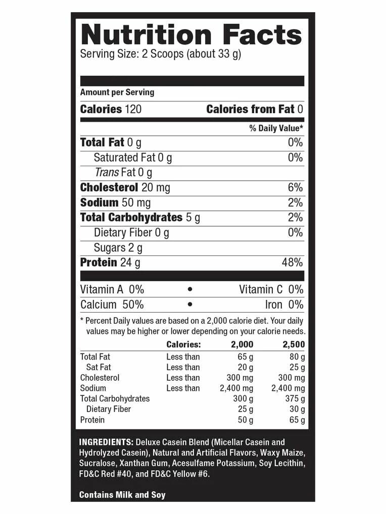 | Дополнительная информация | размер порции в г(мл): 25; состав: Смесь казеинов (мицелярный казеин, гидролизованный казеин), какао порошок, ароматизаторы, кукурузный крахмал, подсластитель: сукралоза, загуститель: ксантановая камедь, подсластитель: ацесульфам К, эмульгатор: соевый лецитин. Информация об аллергене: содержит молоко и сою. |