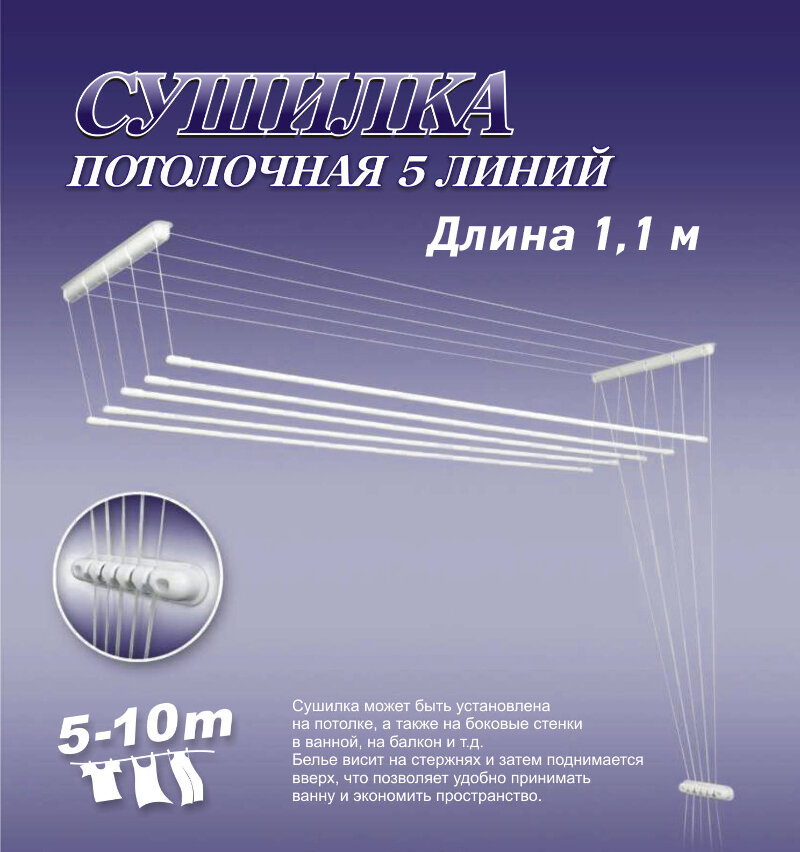 Сушилка для белья "Лиана", металл/пластик, потолочная, рабочая длина 5,5 м, 11кг информация:
