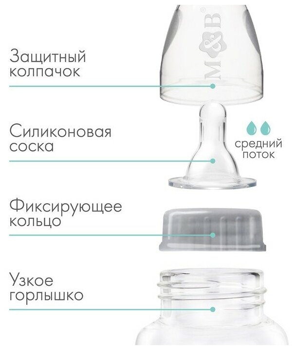 Бутылочка для кормления M&B, классическое горло, от 3 мес, 250 мл, цилиндр, розовый 200 ₽