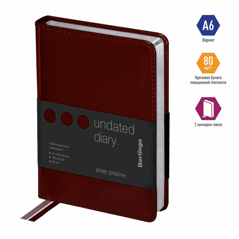 Ежедневник недатированный Berlingo A6, 160 листов, кожзам, "Silver Pristine", серебряный срез, красный (UD0_82602) 818 ₽