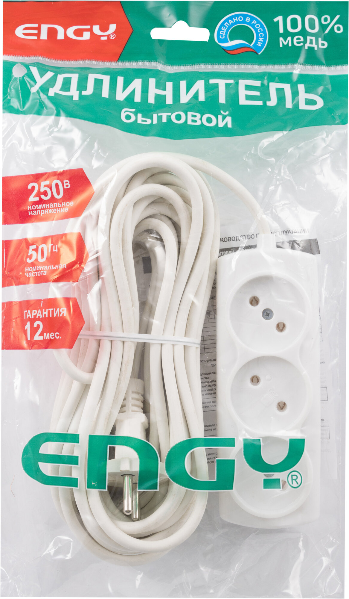 Удлинитель сетевой электрический Engy "Премиум", 10 метров, 3 розетки, белый информация: