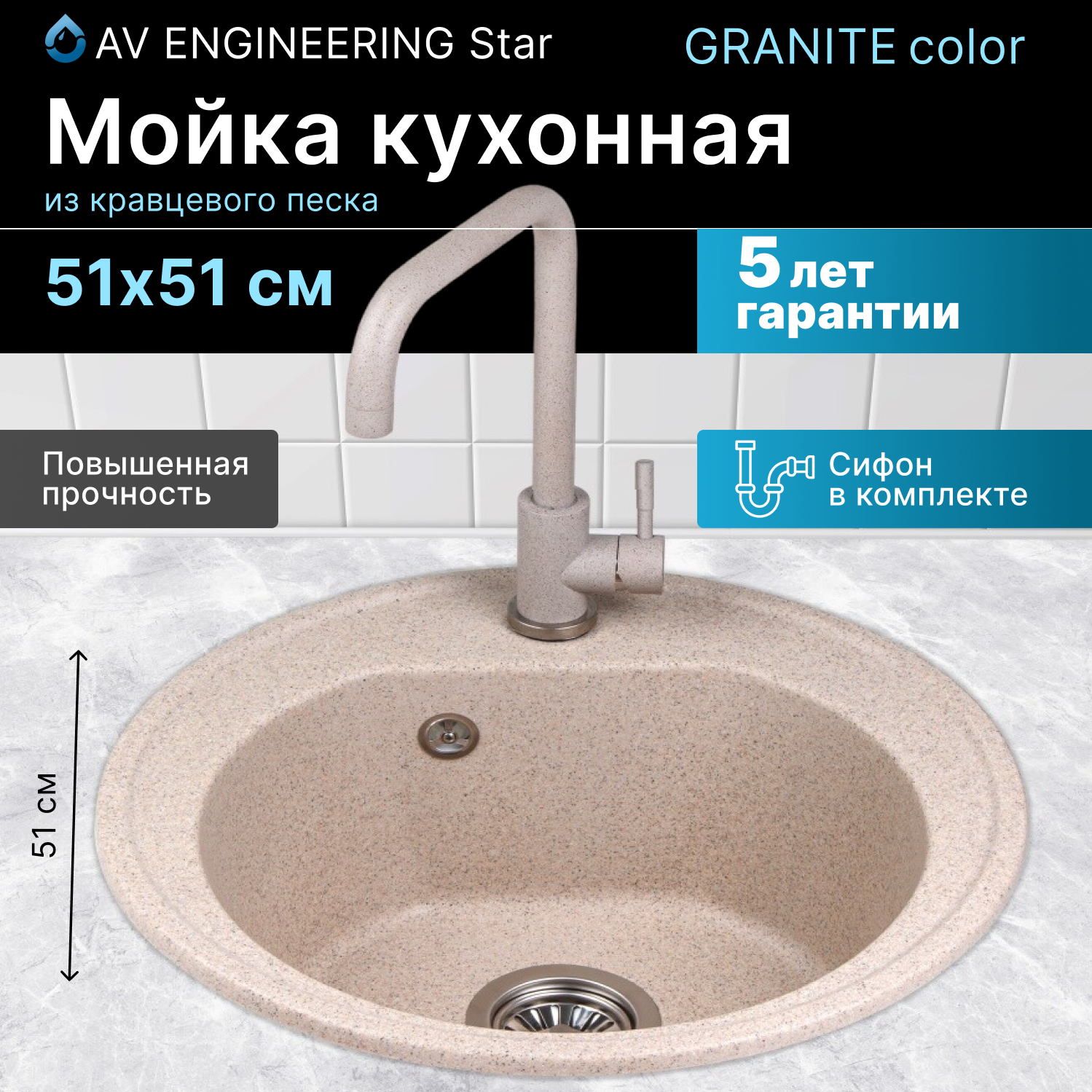Мойка кухонная из искусственного камня STAR гранит 510х505 mm, AV Engineering (AV505515SGTA) 12 030 ₽