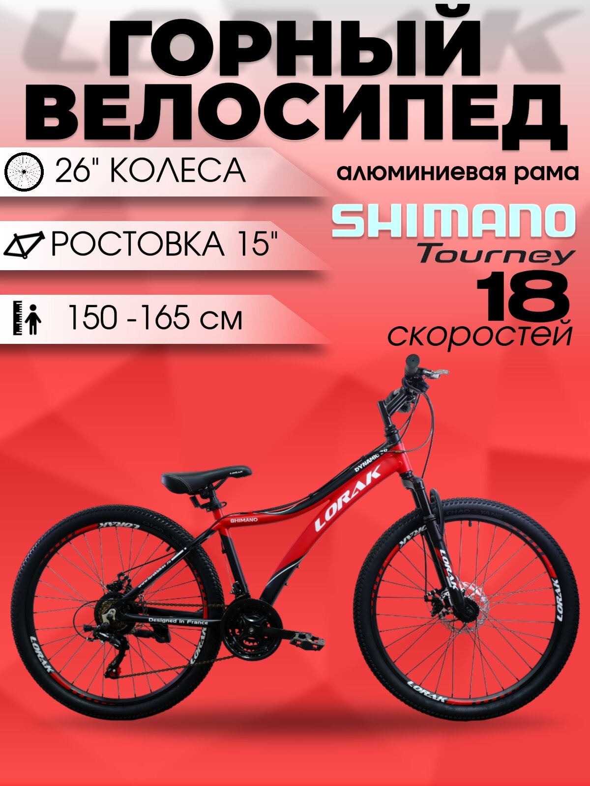 Велосипед Lorak Dynamic 26", черный/красный, 15 рама, для детей и взрослых, 150 - 165см информация: