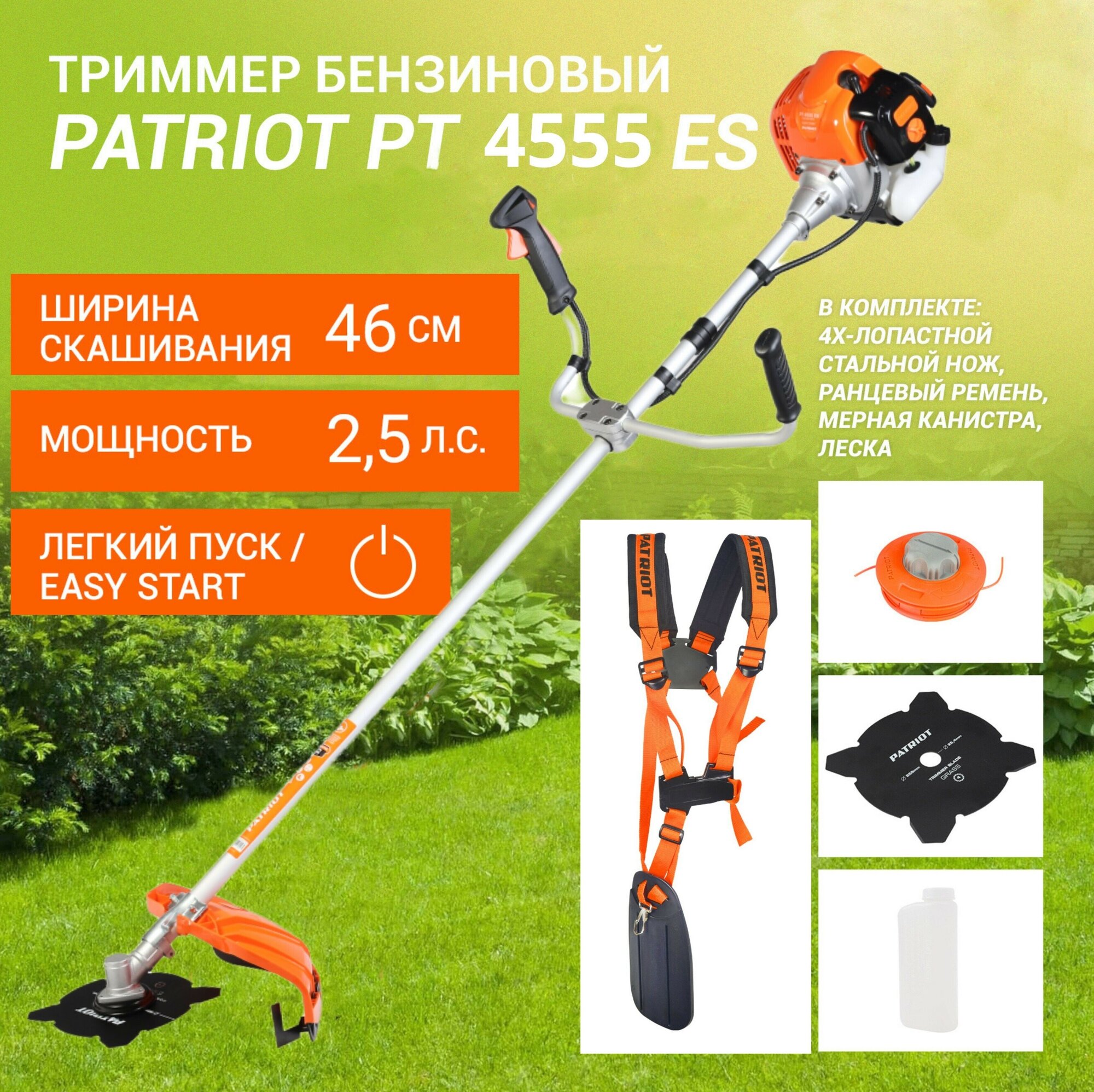 Триммер бензиновый Patriot PT 4555ES Country/ неразборная штанга/ 2.5л. с/ леска/ нож/ ранцевый ремень 250108045 информация: