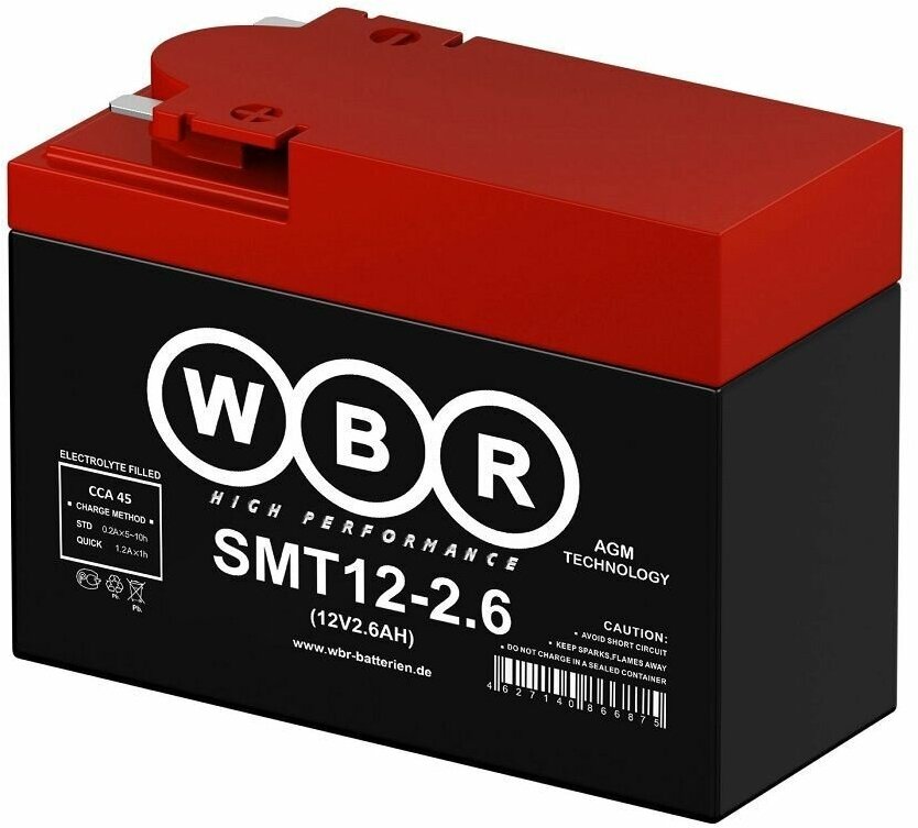 10 цен на Мото аккумулятор стартерный WBR MT12-2.6 12В 2,6Ач (12V 2.6Ah) полярность боковая 45A (YTX4A-BS, CT 12026) AGM аккумулятор для мотоцикла, скутера, мопеда, гидроцикла, квадроцикла, SMT12-2.6