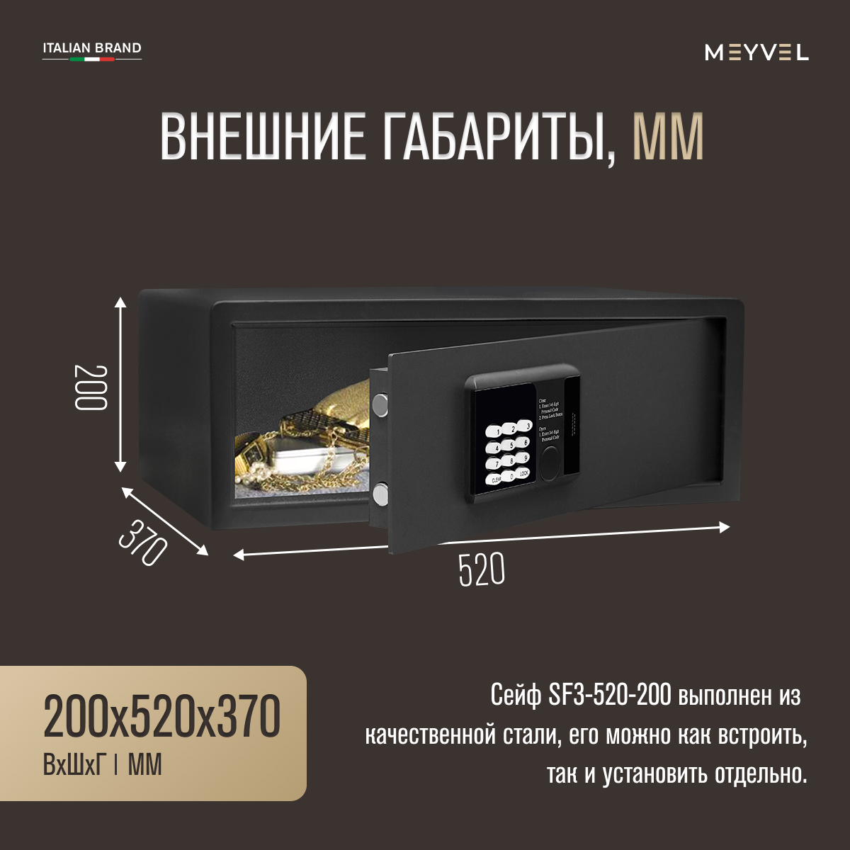Сейф мебельный электронный Meyvel SF3-520-200 для денег и документов (встраиваемый /отдельностоящий тайник с кодовым замком для дома/офиса) информация: