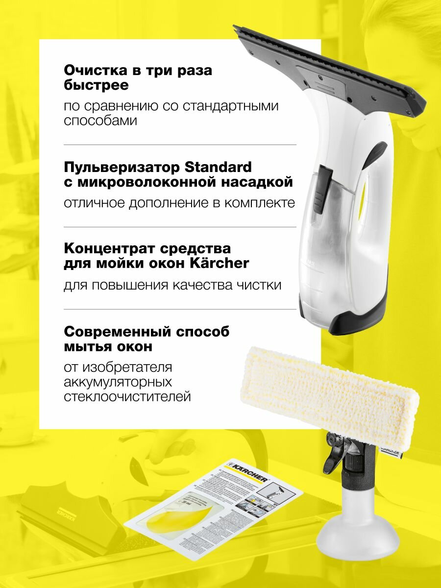 10 цен на Стеклоочиститель мойщик окон Karcher WV 2 Plus 1.633-640.0, аккумуляторный, время автономной работы до 35 минут, бак для грязной воды 100 мл, в комплекте пульверизатор с микроволоконной насадкой