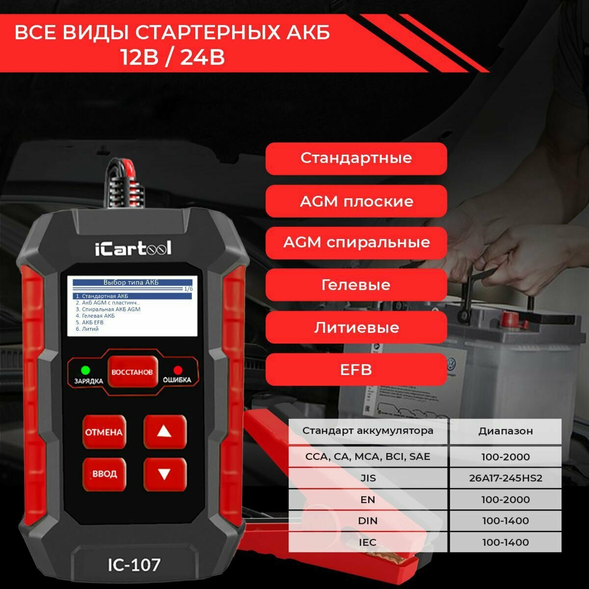 iCarTool Тестер АКБ с функцией восстановления, зарядное устройство, 3 в 1 IC-107 11 290 ₽
