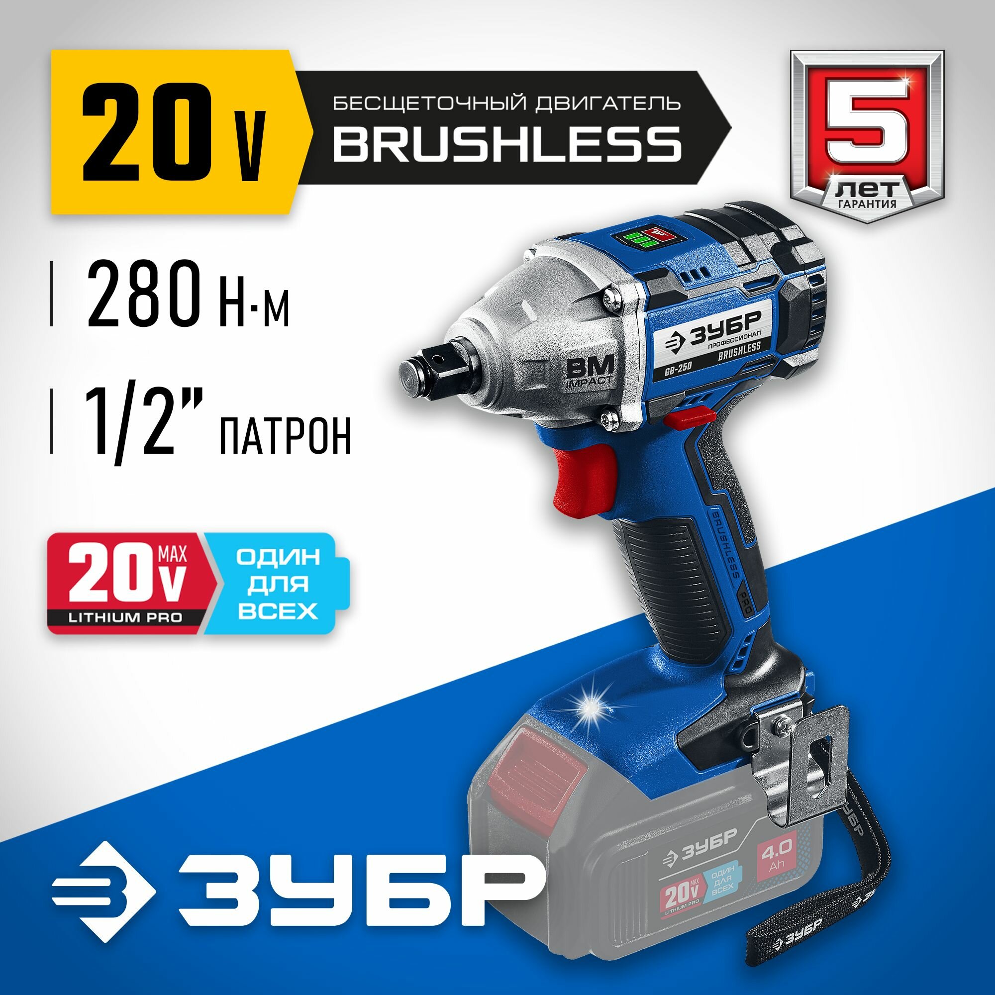 Бесщеточный гайковерт Зубр 20В 2 АКБ 4Ач) в кейсе Профессионал. (GB-250-42)