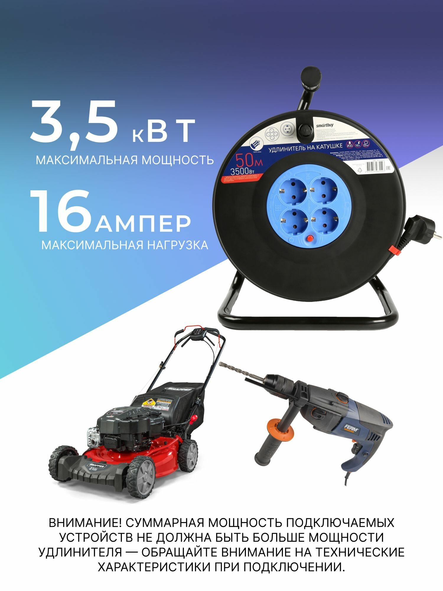 Удлинитель на катушке Smartbuy, 4 гнезда 50 м, с заземлением и предохранителем ПВС 3*1,5 16А/3,5кВт