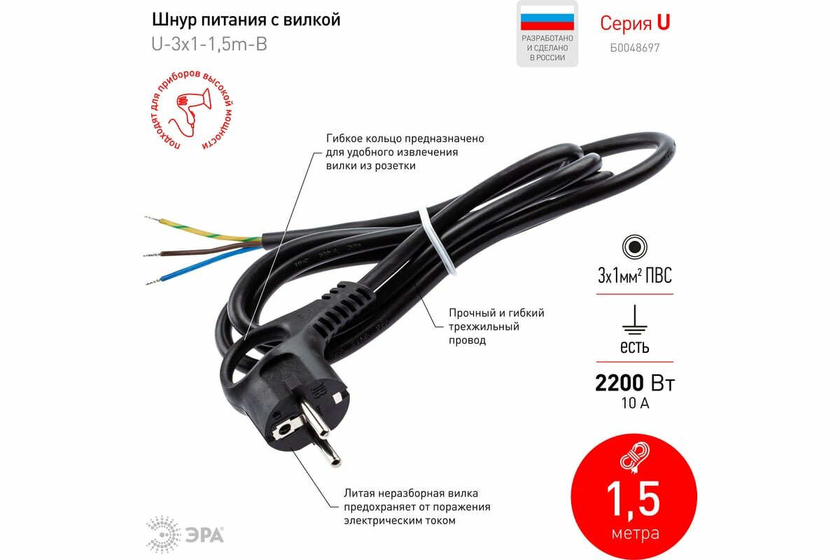 Шнур сетевой с вилкой U-3x1,5-1,5m-B с заземлением 1,5м ПВС 3x1,5мм2 черный, ЭРА Б0048705 (1 шт.)