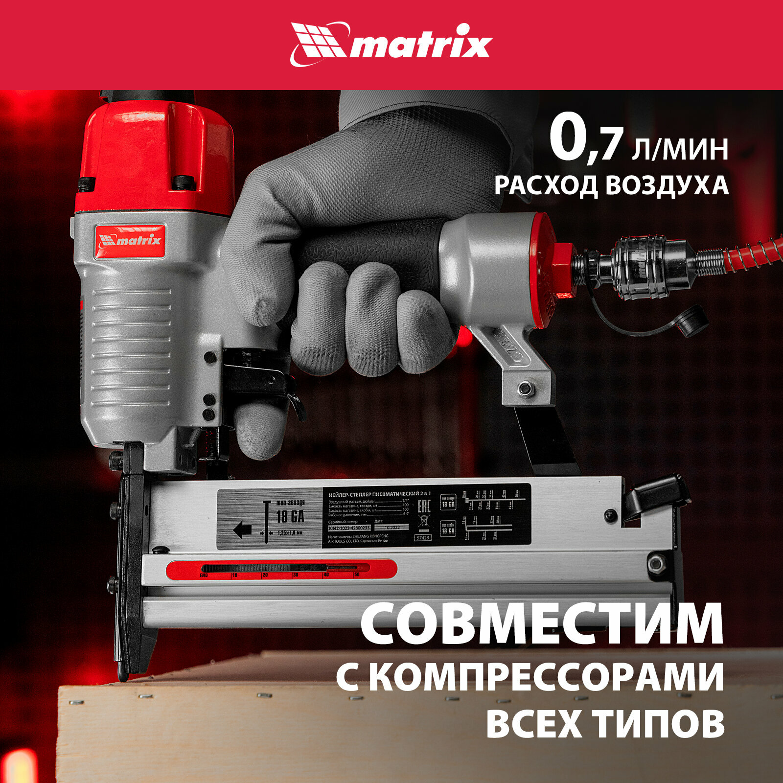 10 цен на Нейлер-степлер пневматический Matrix 2 в 1 с рег. глуб, гвозди 18GA, скобы 18GA 57428