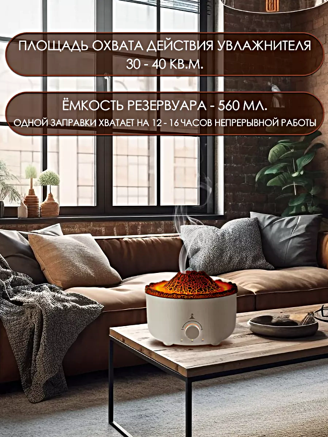 Увлажнитель воздуха Вулкан, Аромадиффузор с имитацией пламени, Увлажнитель воздуха ночник настольный с подсветкой, 560мл, Белый информация: