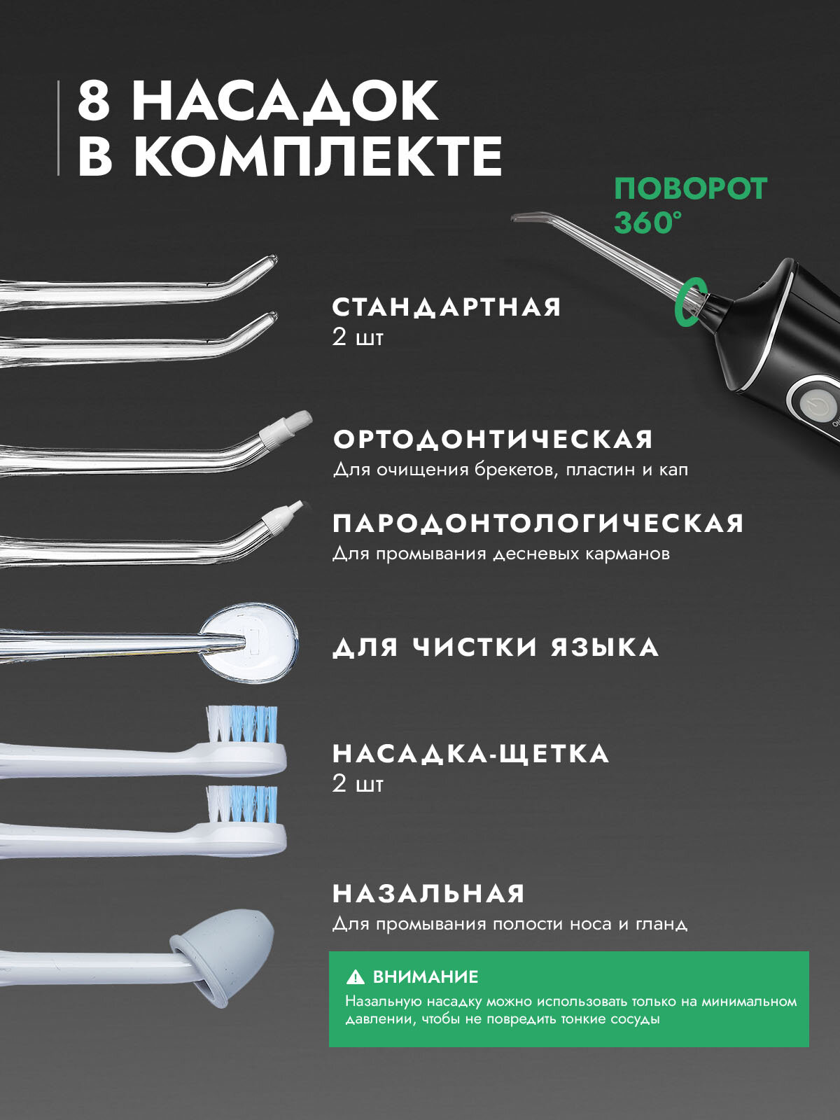 Ирригатор для полости рта портативный Asia Care PRO, 14 насадок, прибор для чистки брекетов, языка, коронок, имплантов, черный 4 750 ₽