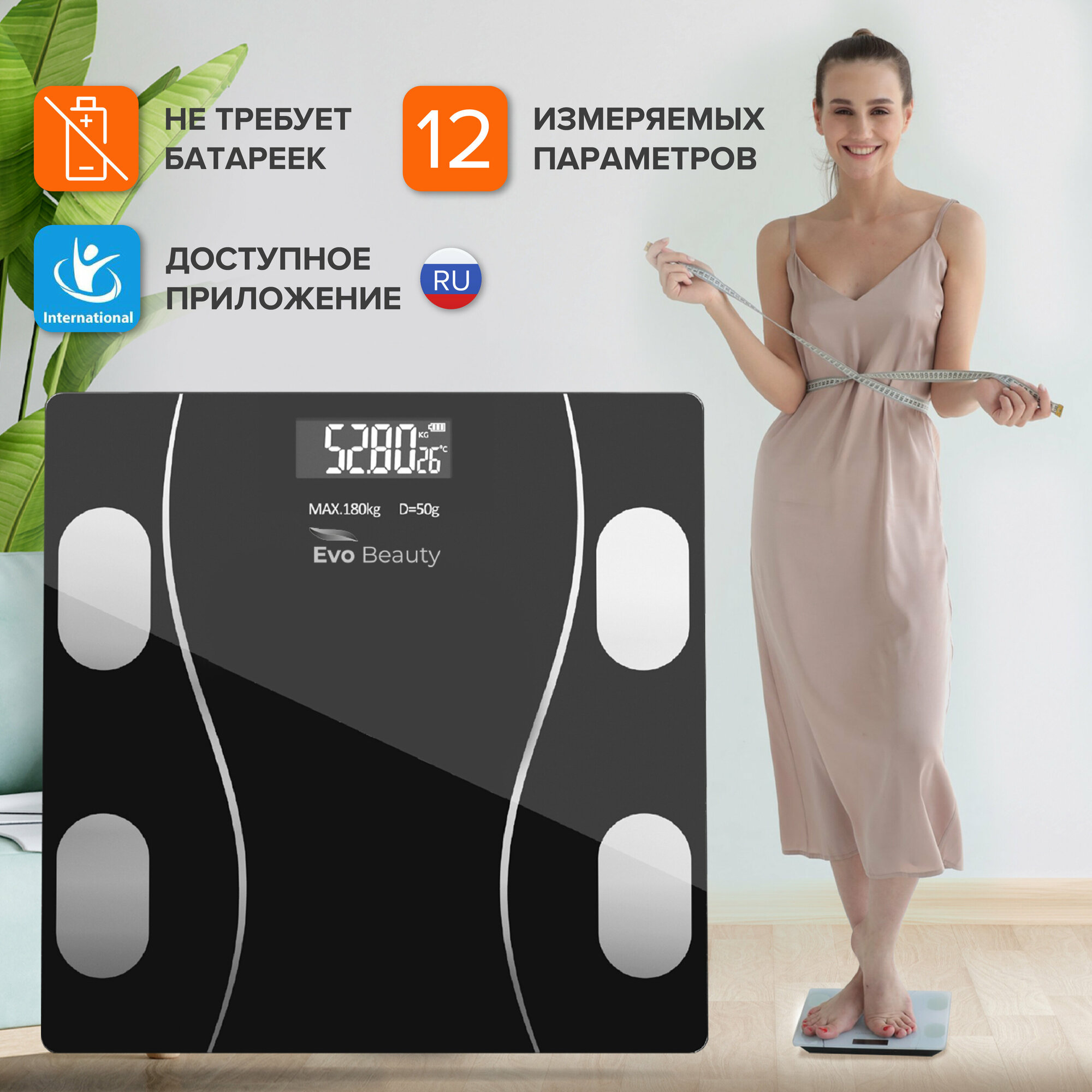 Напольные весы Evo Beauty, с BMI, с аккумулятором, синхронизация со смартфоном информация: