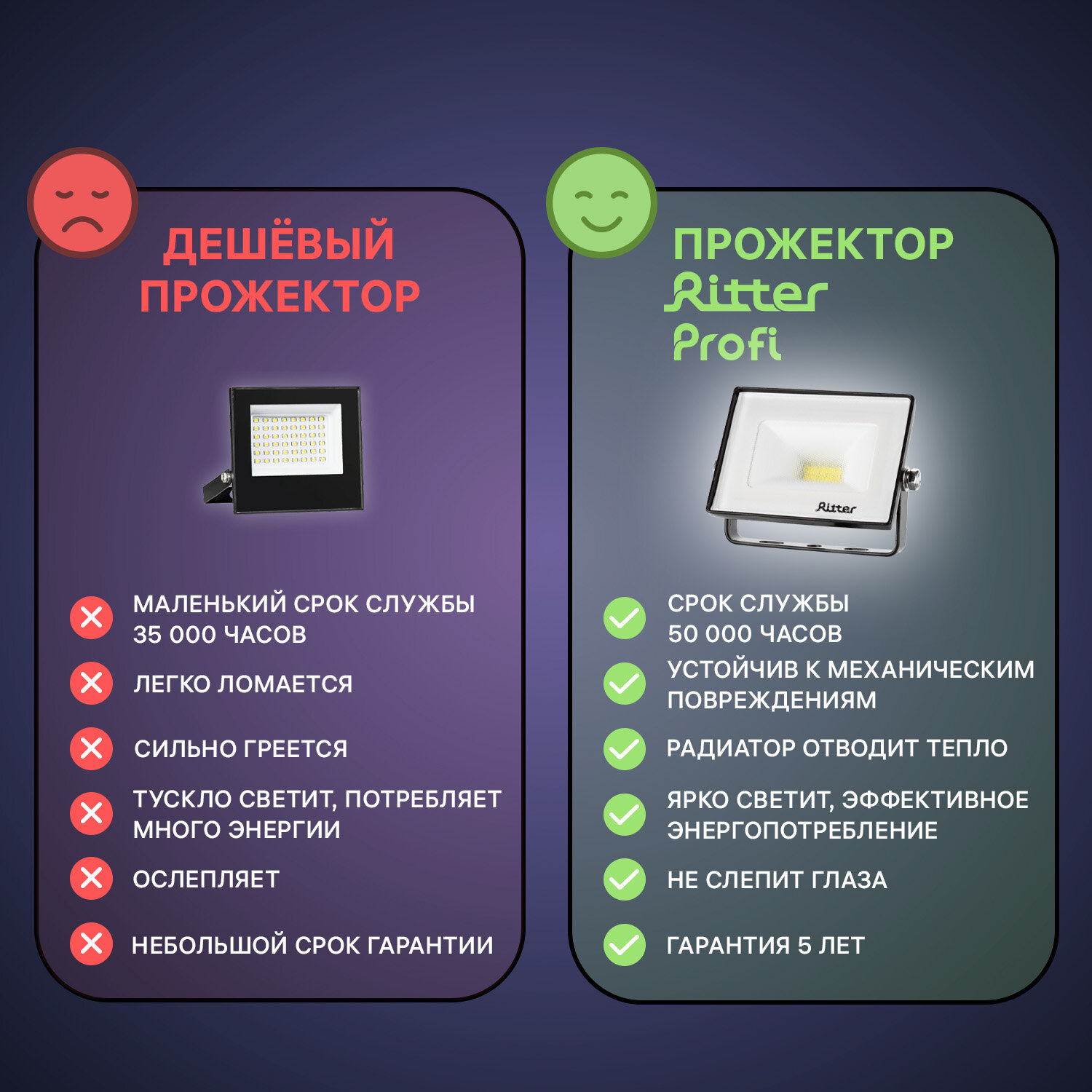 Прожектор светодиодный Ritter Profi, 50Вт, 180-240В, IP65, 5000Лм, 2700К, чёрный, 53428 4