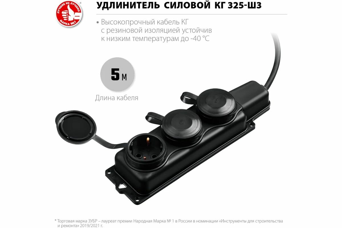 Силовой удлинитель ЗУБР КГ-325-Ш3, КГ, 3 x 2.5 мм2, IP44, 5 м, 3 гн, 4000 Вт, Профессионал (55024-05) информация: