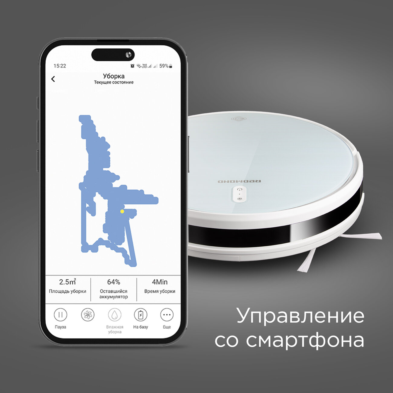 Умный робот-пылесос REDMOND RV-R640S, сухая и влажная уборка, 2 часа без подзарядки, управление со смартфона, тонкий. информация: