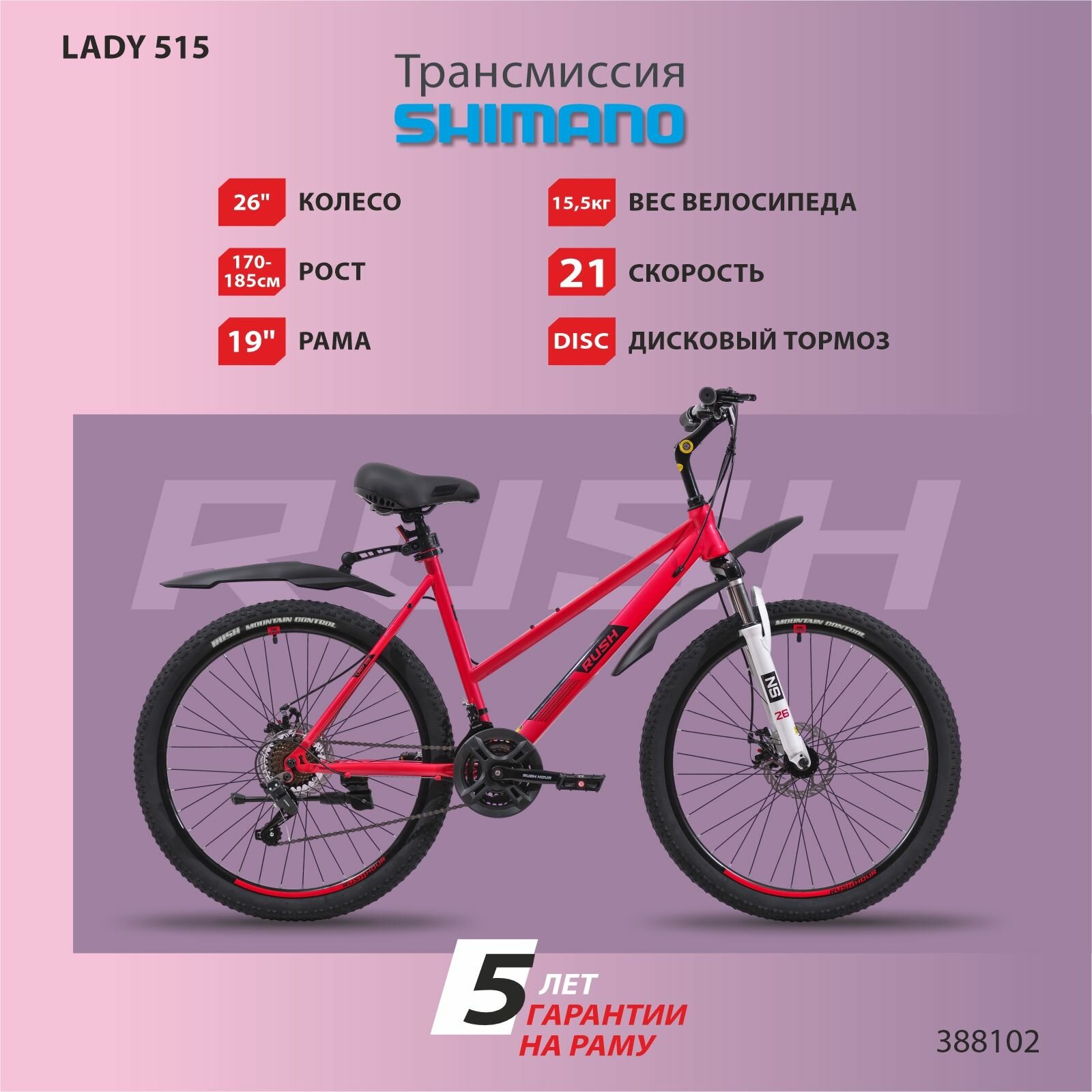 Велосипед горный дисковый 26" рост 170-185см 21 скоростей красный рама 19" велик переключатель SHIMANO скоростной велосипед RUSH HOUR LADY 515 информация: