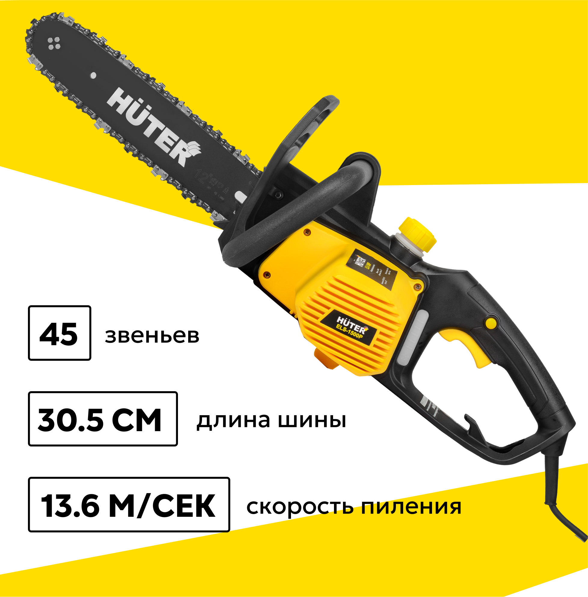 Электропила HUTER ELS-1500Р, 1500 Вт, скорость пиления 13,6 м/с, шина - 30 см/12", автоматическая смазка информация: