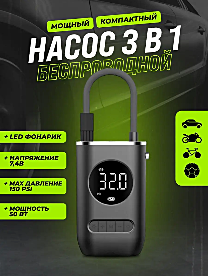Компрессор беспроводной, Портативный насос универсальный для машины, мотоцикла, велосипеда, мяча, LED дисплей, Черный информация: