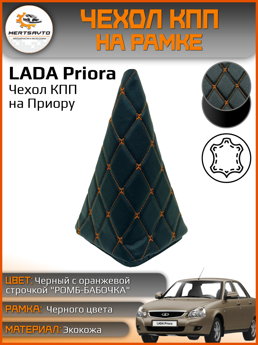 Отзывы на Чехол коробки переключения передач КПП на ВАЗ-2170 Лада Приора (Lada Priora) черный с оранжевой строчкой "ромб-бабочка"