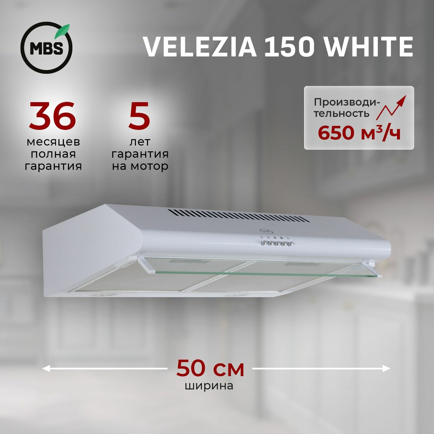 Кухонная вытяжка подвесная MBS VELEZIA 150 WHITE/50 см/производительность 650м3/ч, низкий уровень шума. информация: