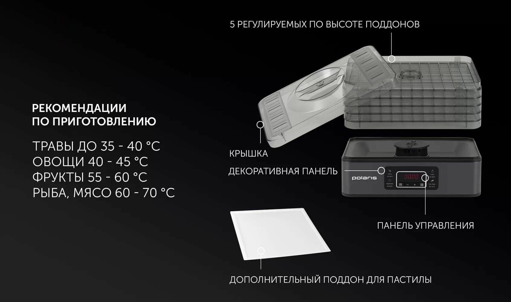 Сушилка для овощей и фруктов Polaris PFD 2402H Pro, черный, 19шт