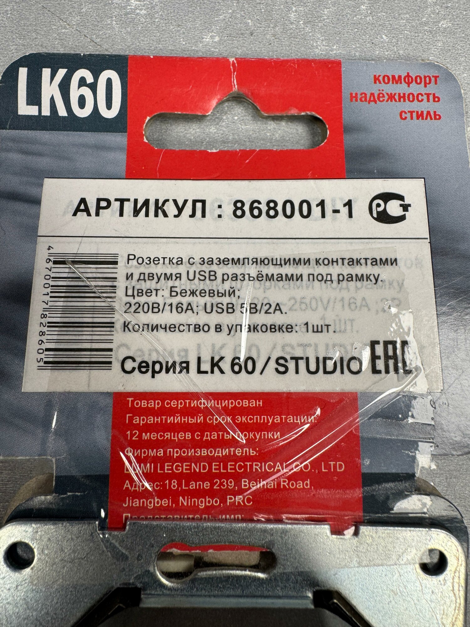 Розетка с заземляющим контактом + 2хUSB разъем, 2А Экопласт LK60, бежевый 868001-1 информация: