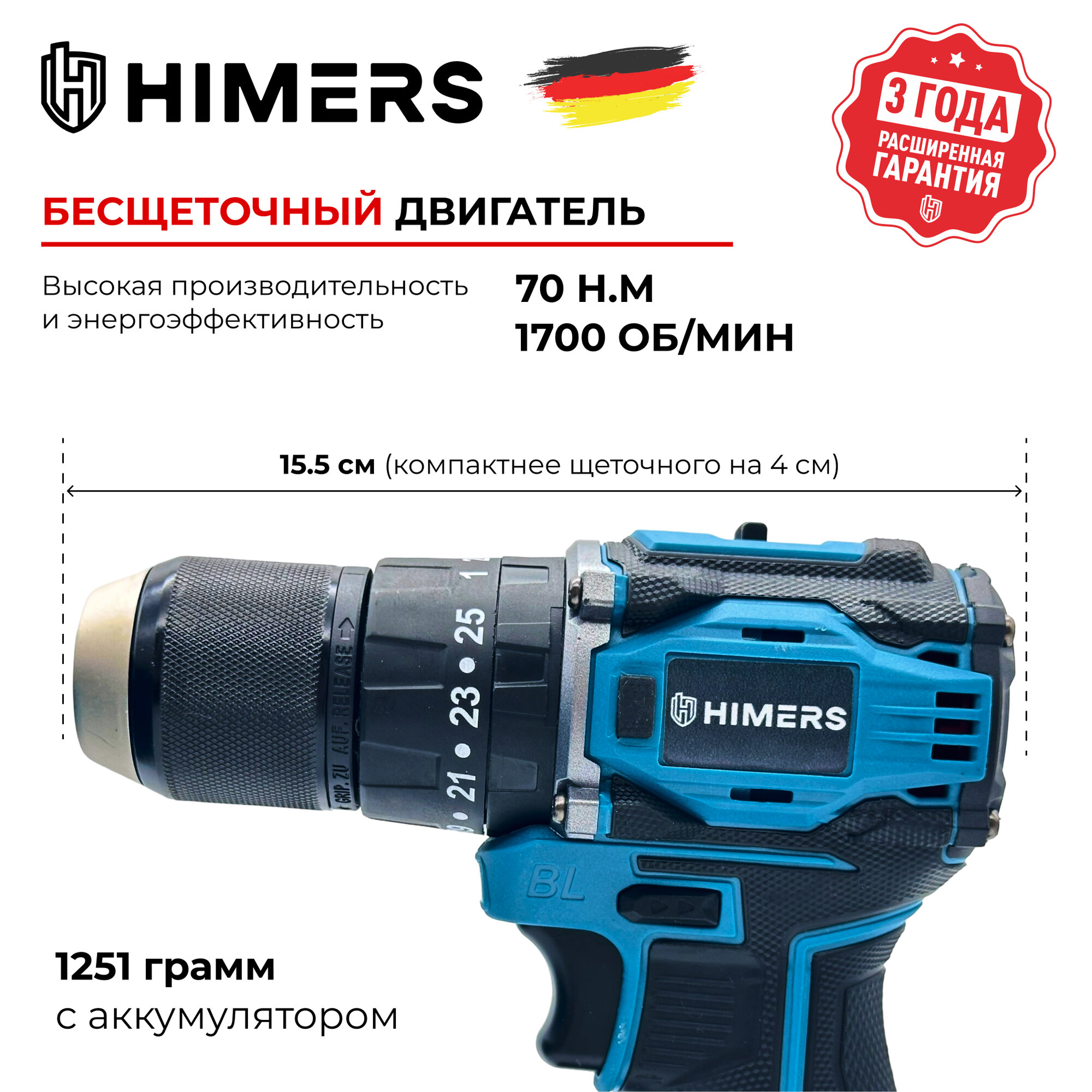10 цен на Бесщеточный шуруповерт HIMERS DF70B-BL аккумуляторный 24V, 2 АКБ по 3 А. ч, 70 Н. м, 13мм патрон, кейс