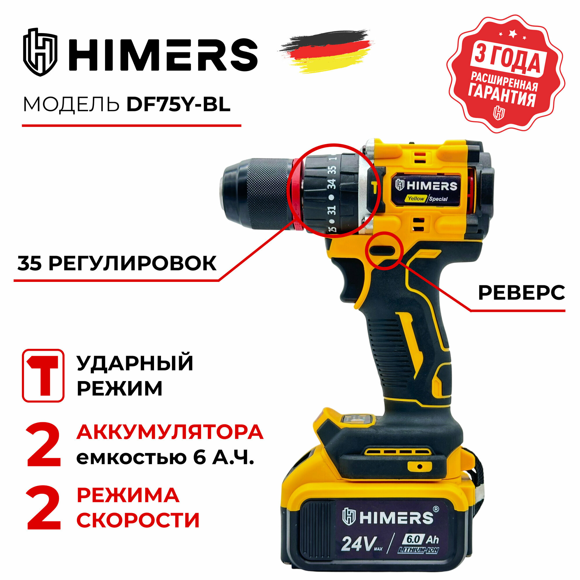 Бесщеточный шуруповерт HIMERS DF75Y-BL аккумуляторный 24V, 2 АКБ по 6 А. ч, 75 Н. м, 13мм патрон, Кейс , ударный информация: