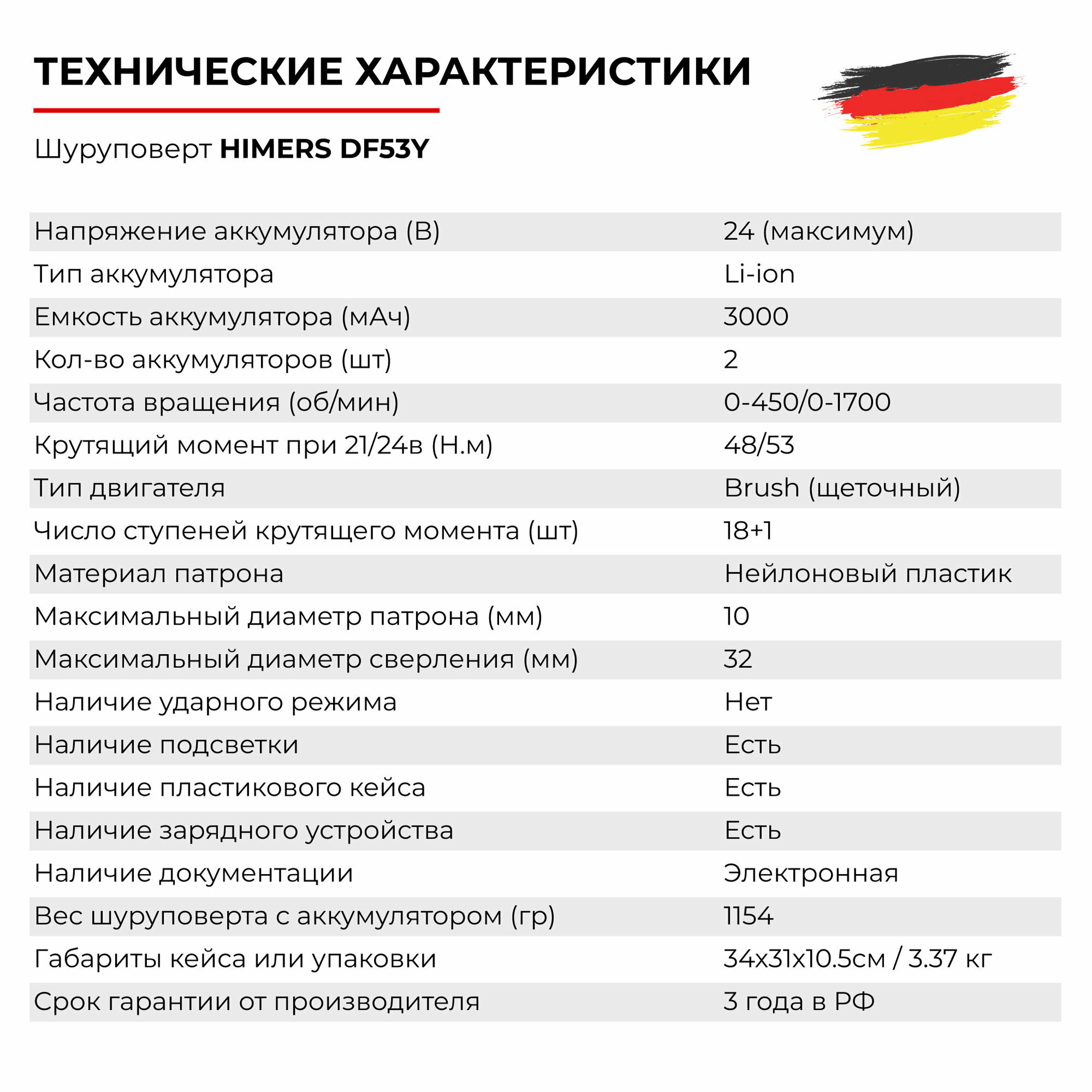 10 цен на Дрель - шуруповерт HIMERS DF53Y аккумуляторный 24V, 2 АКБ по 3 А. ч, 53 Н. м / Кейс с набором бит, свёрел, головок инструментов 30 предметов / для сверления, долбления, закручивания 24В
