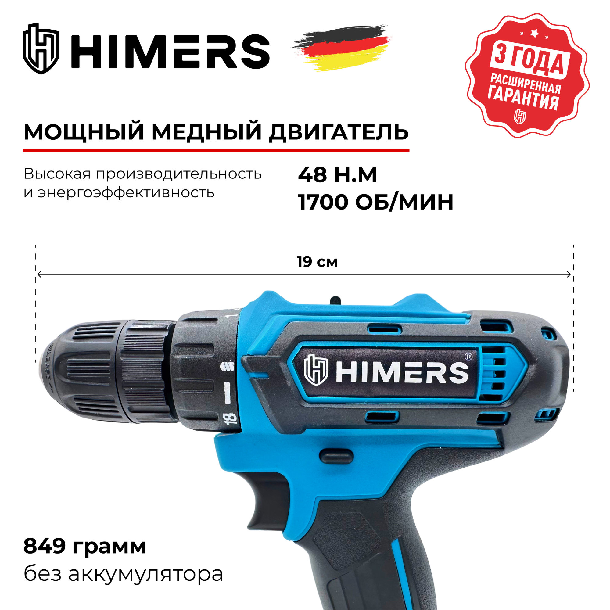 Бесщеточный шуруповерт HIMERS DF60В-BL аккумуляторный 18V, 2 АКБ по 3 А.ч., 60 Н.м., кейс 7 300 ₽