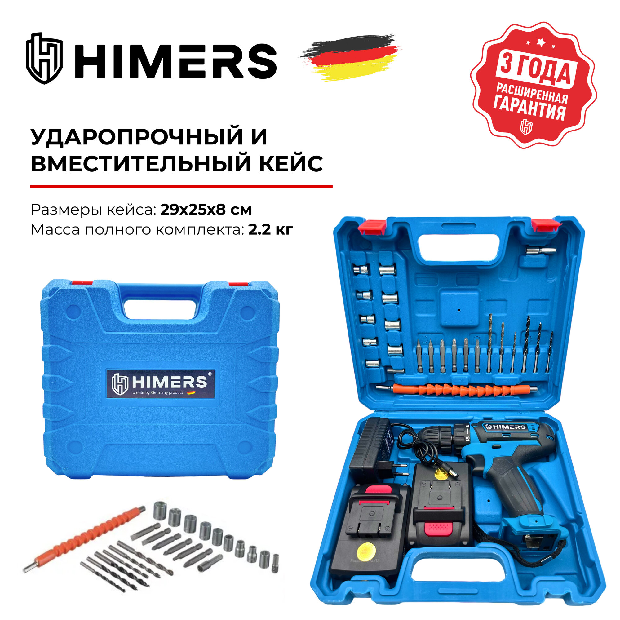 Дрель - шуруповерт HIMERS DF21B аккумуляторный 21V, 2 АКБ, 50 Н.м / Кейс с набором бит, свёрел, головок инструментов 24 предмета