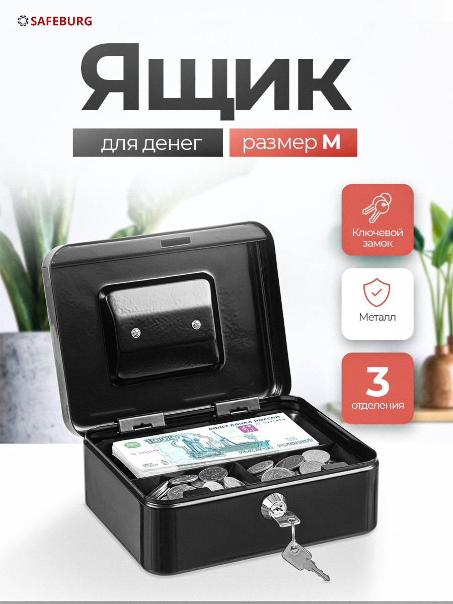 Ящик для денег SAFEBURG Keeper-20С Black Gloss, переносной сейф, кэшбокс, 3 отделения, шкатулка для ценностей, тайник 1 573 ₽