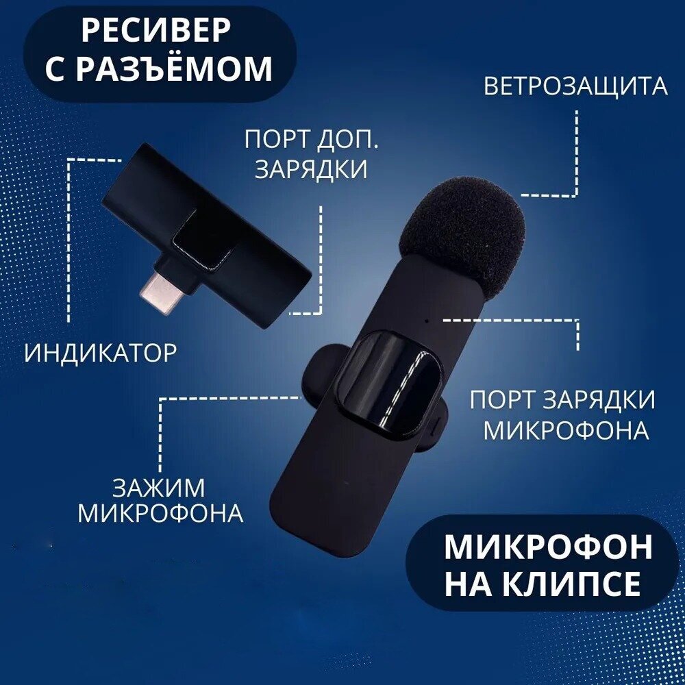 Микрофон петличный беспроводной USB Type-c для телефона, петличка на одежду для записи звука, стрима блогеров, с ветрозащитой, портативный информация: