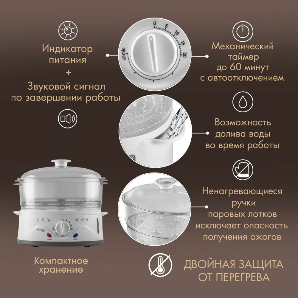 | Особенности конструкции | индикатор включения, индикатор уровня воды, компактное хранение, съемные решетки, чаша для риса |