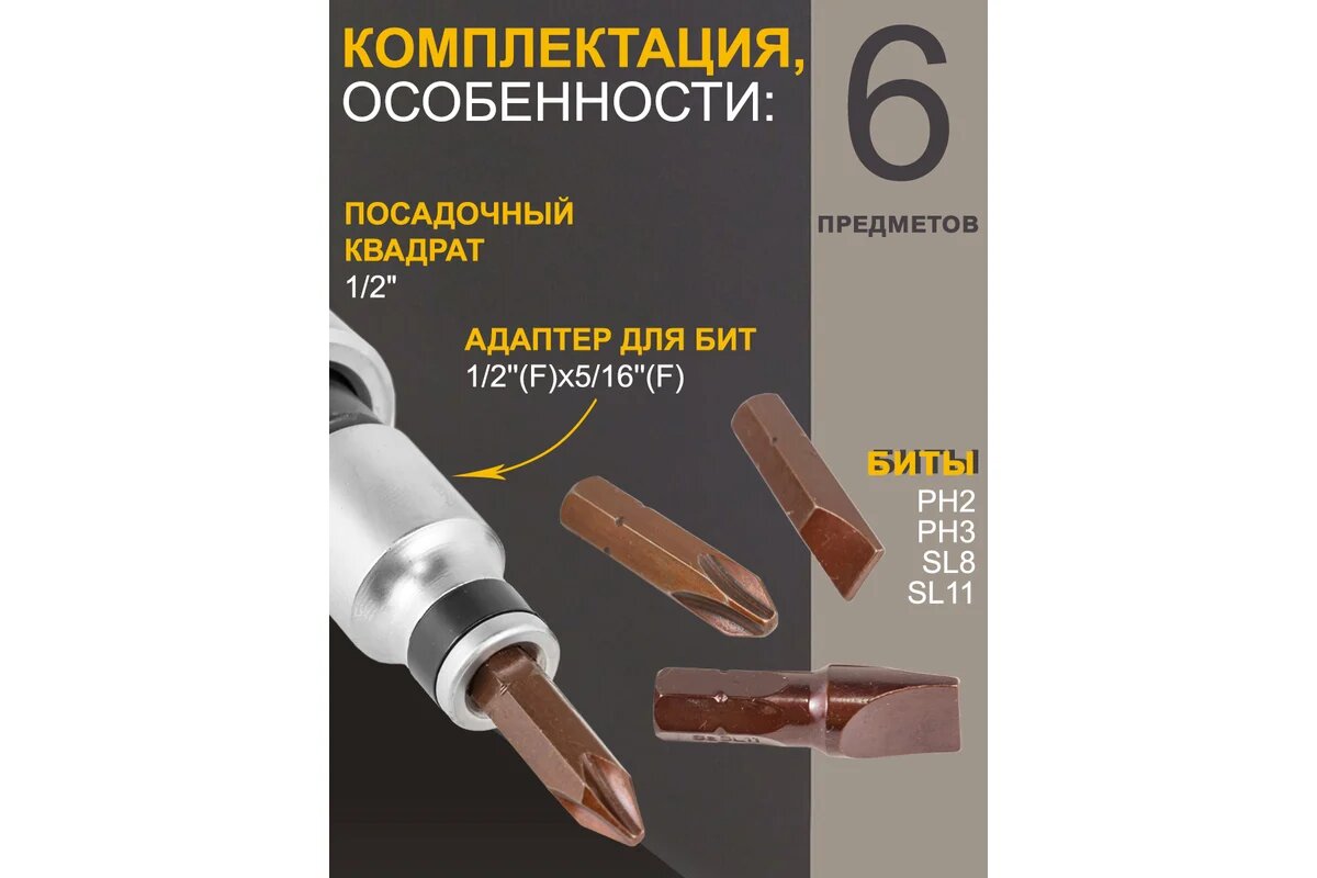 FORCEKRAFT FK5064 FK-5064 Отвертка ударная с набором бит и адаптером, 6пр 1/2''(F)х5/16''(F) (PH2,3х36мм, SL9,11х36мм)