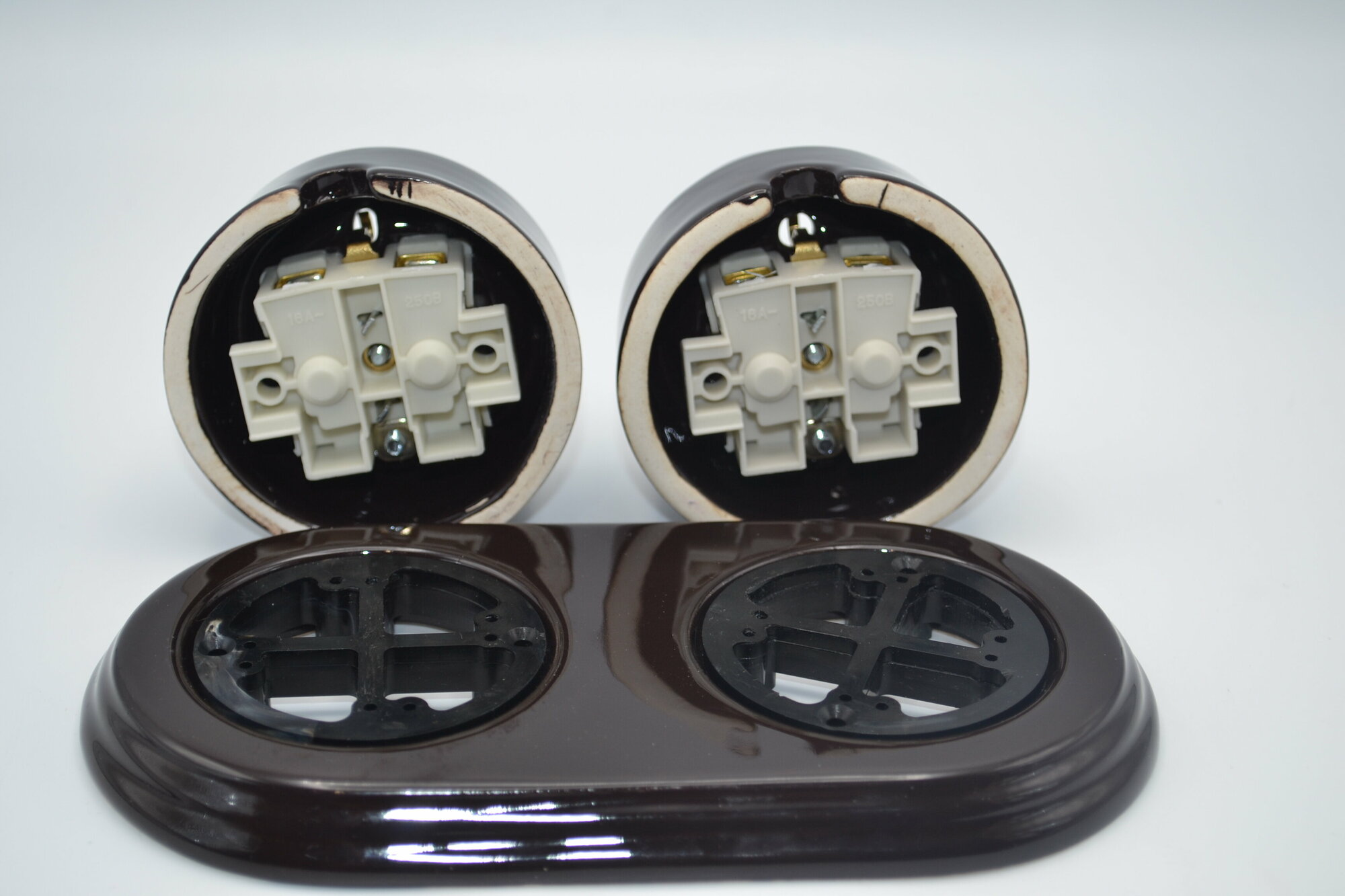 Розетка двойная ретро керамическая Арбат с заземлением Коричневая, Interior Electric, SCIE/BR-04-2
