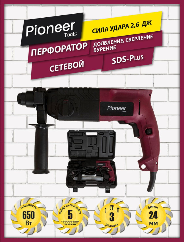 Отзывы на Перфоратор сетевой Pioneer RH-M650-01C с быстрозажимным патроном, 3 режима, реверс, SDS Plus, 3 бура 6/8/10мм, 650 Вт