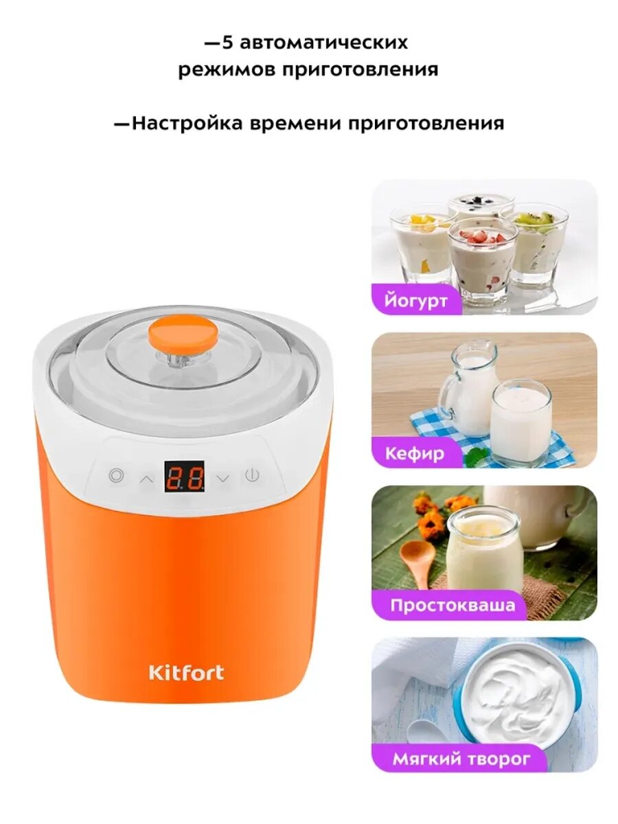 Йогуртница Kitfort КТ-4090, мощность 20Вт, емкость на 1 литр, 5 программ приготовления, оранжевая информация: