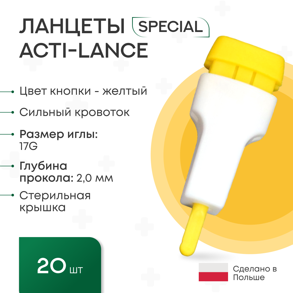 Ланцеты Acti-lance Special для капиллярного забора крови 20 шт, глубина прокола 2,0 мм, лезвие, желтые информация: